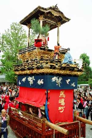 山車は津島の中では最大で、龍などの豪華な彫刻が施されています。水引幕は濃紺地に群鳩の刺繍です。