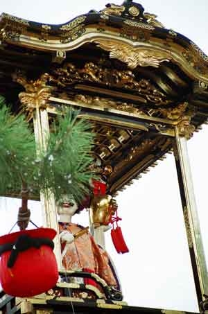 からくりは「大黒」 大黒、小唐子、唐子、采振り人形で構成されています。大黒の打出の小槌から唐子が飛び出してチャッパを打つところが見所です。大黒の感情表現も微笑ましく見て楽しいです。前人形は采振り人形です。