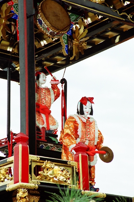 からくりは「唐子遊」 3体の唐子と御幣振り人形です。前の唐子はチャッパを打ち、後ろの唐子は天雲太鼓を叩きます。その唐子の乗っている蓮台を太鼓の所まで持ち上げるのは脇の唐子です。