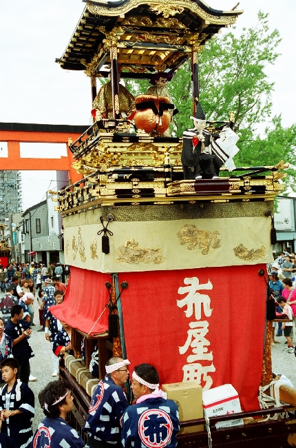 からくりは「恵比寿と大黒」 表情豊かな二福神です。前方に大きな宝袋が置かれています。恵比寿が鯛を釣り上げれば、大黒は持った小槌で宝袋を縦に割ります。割れた中から宝船が現れます。宝船の帆が風に吹かれるように揺れます。前人形は采振りです。