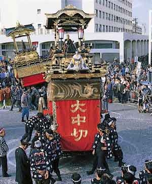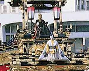 からくりは、「翁と唐子遊」 四本柱の大将座に軍配を持った大将人形が座り、下に神楽太鼓と唐子人形、一番前には采振り人形がいます。唐子人形はせり上がった蓮台(橋)を渡り、神楽太鼓を叩きます。その時、大将人形は右手の軍配を上下にふる動作を見せます。